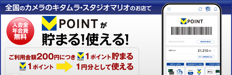 アプリに登録いただくと、全国の全国のカメラのキタムラ、スタジオマリオで、200円(税抜・値引き後)のお買い物ごとに1ポイント貯まり、1ポイント1円としてお使いいただけます。Vポイント加盟店でご利用いただけます。